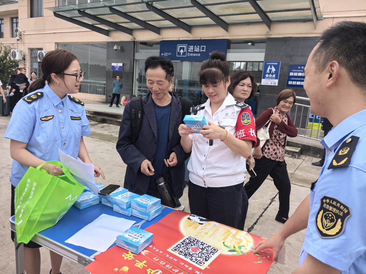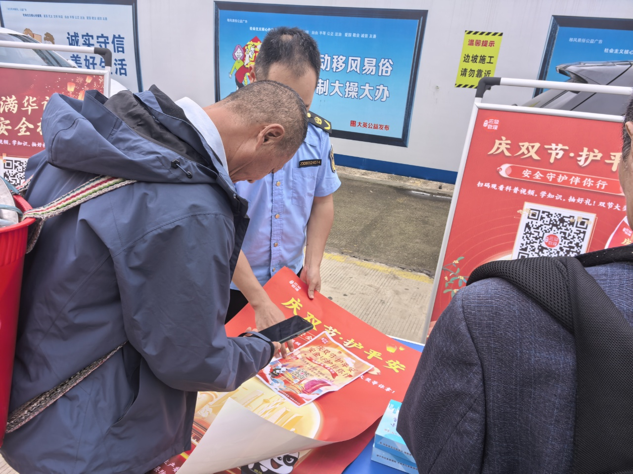 “扫码看视频,领奖还能学安全!”应急工作人员的热情邀约,让过往人群纷纷驻足。即将拎包出发的旅人,能在这里get旅途安全锦囊;打算宅家过节的居民,可解锁居家防护妙招;计划打卡景区的游客,也能收获游玩安全指南。现场那一张张融合国旗、圆月、灯笼元素的宣传海报,既是节日氛围担当,更是安全科普“神器”——指尖扫码就能观看安全视频,还能抽取现金红包,趣味与实用双双拉满。