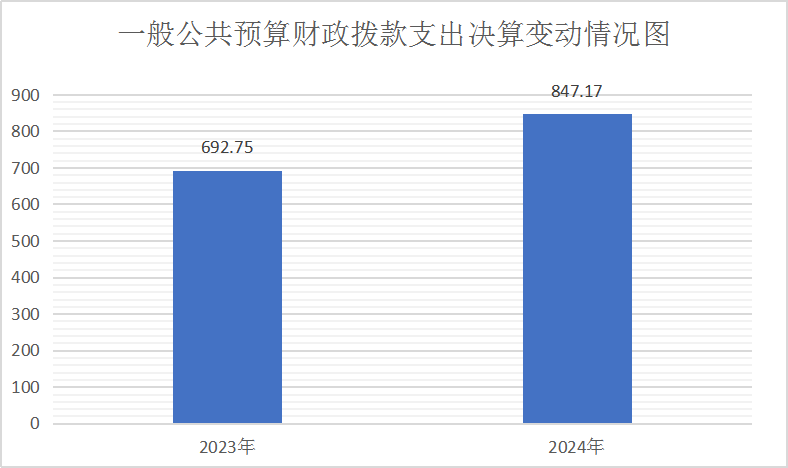 2024年一般公共预算财政拨款支出847.17万元,占本年支出合计的86.19%。与2023年692.75万元相比,一般公共预算财政拨款支出增加154.42万元,增加22.29%。主要变动原因是本年度在职人员增加,工资增加。