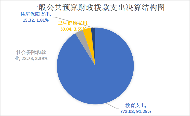 2024年一般公共预算财政拨款支出847.17万元,主要用于以下方面:教育支出(类)773.08万元,占91.25%;社会保障和就业(类)支出28.73万元,占3.39%;卫生健康(类)支出30.04万元,占3.55%;住房保障(类)支出15.32万元,占1.81%。
