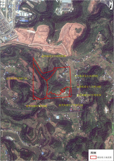 拟征收土地位于盐井街道宝石岩村集体、9、10、14组,红旗村7、8组范围内,范围见《拟征收土地范围示意图》(附后),拟征收土地面积以土地现状调查面积为准。