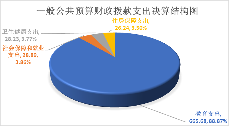 2024年一般公共预算财政拨款支出749.04万元,主要用于以下方面:教育支出(类)665.68万元,占88.87%;社会保障和就业(类)支出28.89万元,占3.86%;卫生健康支出28.23万元,占3.77%;住房保障支出26.24万元,占3.5%。