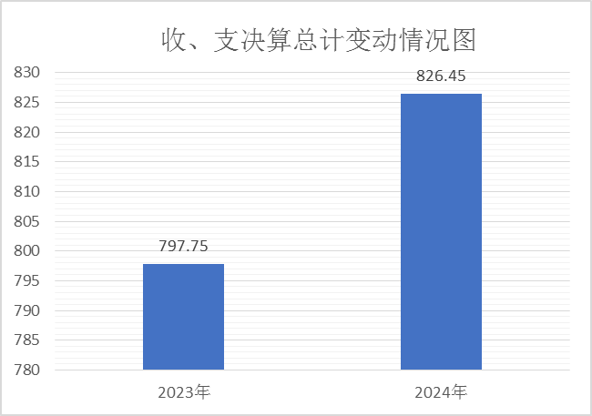 2024年度收、支总计826.45万元。与2023年797.75万元相比,收、支总计增加28.7万元,增加3.6 %。主要变动原因是工资调标、项目支出等收、支增加。