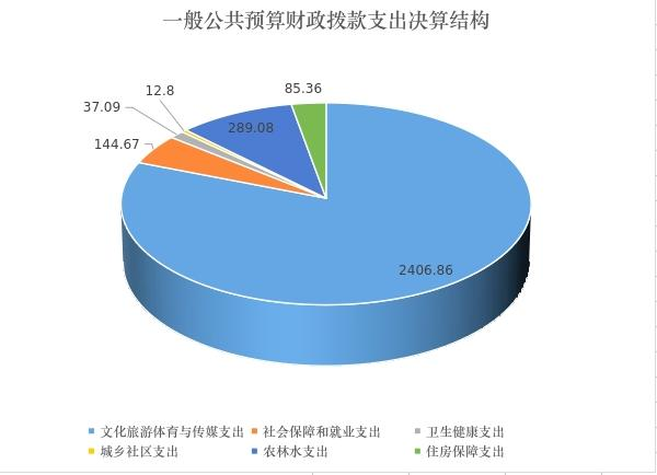 2024年一般公共预算财政拨款支出2975.86万元,主要用于以下方面:文化旅游体育与传媒支出2406.86万元,占80.88%;社会保障和就业支出144.67万元,占4.86%;卫生健康支出37.09万元,占1.25%;城乡社区支出12.8万元,占0.43%;农林水支出289.08万元,占9.7%;住房保障支出85.36万元,占2.87%。