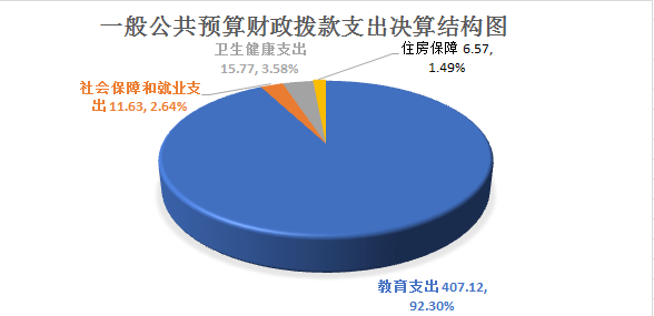 2024年度一般公共预算财政拨款支出441.09万元,主要用于以下方面:教育支出407.12万元,占92.29%;社会保障和就业支出11.63万元,占2.64%;卫生健康支出15.77万元,占3.58%;住房保障支出6.57万元,占1.49%。