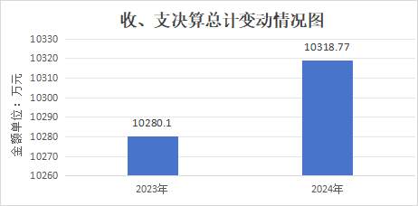 2024年度收、支总计均为10318.77万元。与2023年度相比,收、支总计各增加38.67万元,增长3.8%。主要变动原因是项目收、支增加。