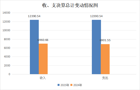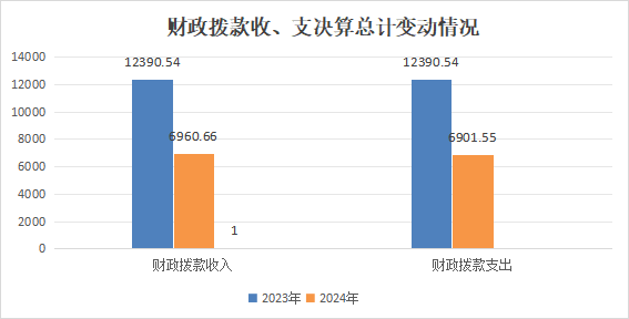2024年度收入总计6960.66万元,与2023年相比,收入减少5429.88万元,下降43.82%。主要变动原因是部分社保资金(代缴社会保险费、生活补助等)项目在决算报表中由县级财政部门代为列支;2024年度支出总计6901.55万元,与2023年相比,支出减少5488.99万元,下降44.30%。主要变动原因是主要变动原因是部分社保资金(代缴社会保险费、生活补助等)项目在决算报表中由县级财政部门代为列支。