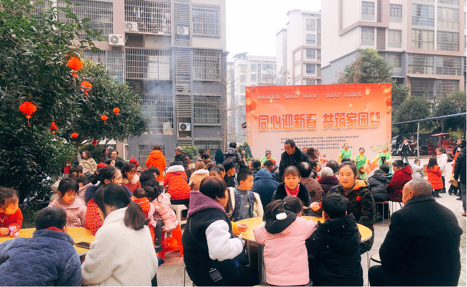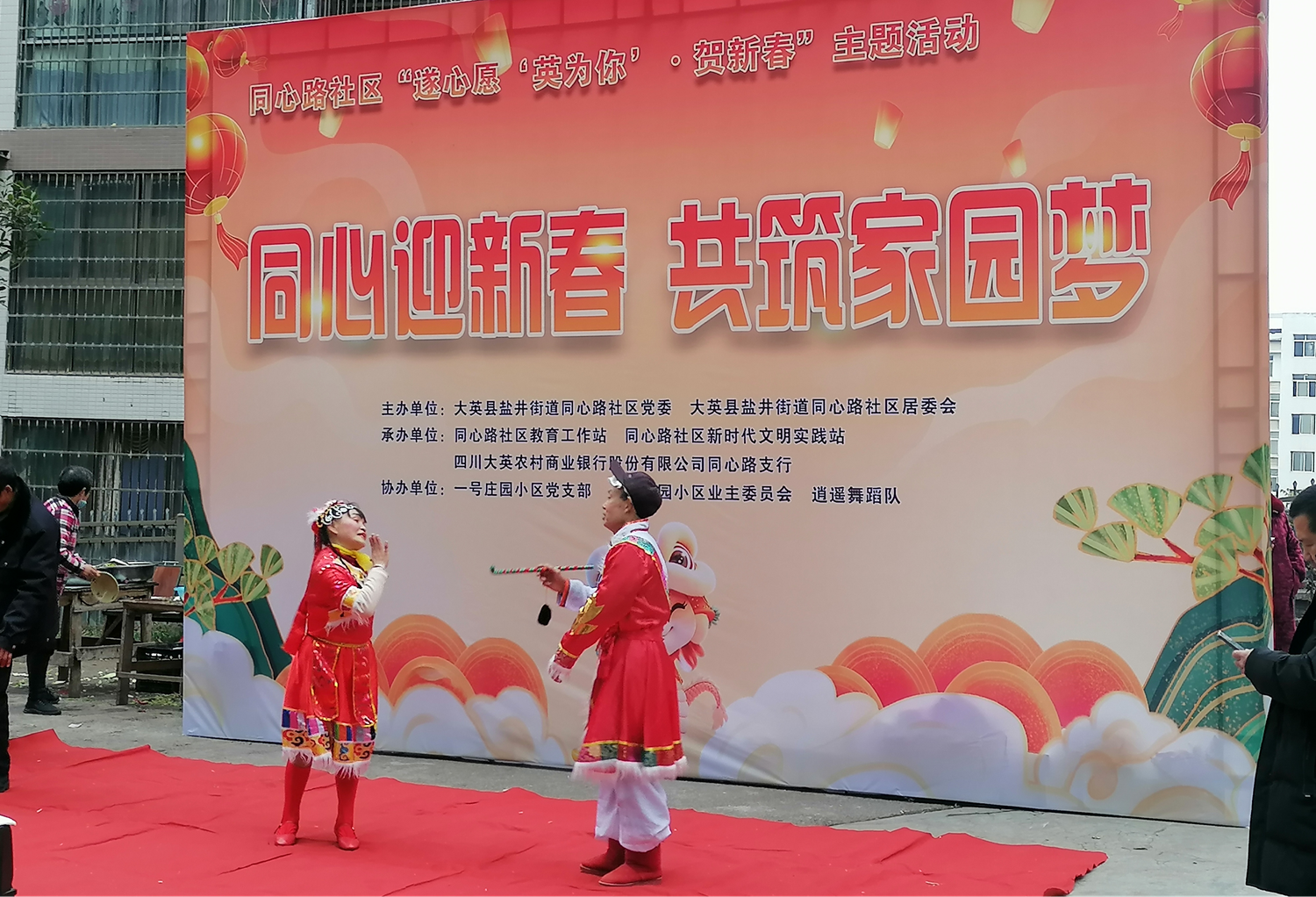 为了弘扬中华优秀传统文化,拉近党群关系,加强社区与小区居民之间的紧密联系,1月17日,大英县盐井街道同心路社区举办“同心迎新春·共筑家园梦”春节坝坝宴活动。活动由同心路社区党委和居委会共同主办,并得到了同心路社区老体协、四川大英农村商业银行股份有限公司同心路支行的大力协助,以及一号庄园小区党支部、业主委员会和逍遥舞蹈队的积极参与和支持。