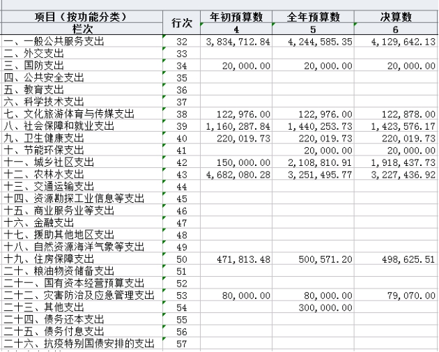 1.一般公共服务(类)人大事务(款)代表工作(项):支出决算为2.34万元,完成预算100%;一般公共服务(类)政府办公厅(室)及相关机构事务(款)政府行政运行(项):支出决算为344.43万元,完成预算100%;一般公共服务(类)政府办公厅(室)及相关机构事务(款)政府事业运行(项):支出决算为44.41万元,完成预算100%;一般公共服务(类)政府办公厅(室)及相关机构事务(款)政府一般行政管理事务(项):支出决算为11.96万元,完成预算100%;一般公共服务(类)政府办公厅(室)及相关机构事务(款)其他政府办公厅(室)及相关机构事务支出(项):支出决算为6.82万元,完成预算100%;一般公共服务(类)党委办公厅(室)及相关机构事务(款)其他党委办公厅(室)及相关机构事务支出(项):支出决算为3.00万元,完成预算100%。