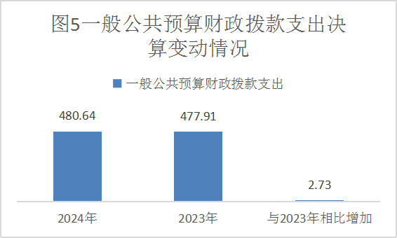 2024年度一般公共预算财政拨款支出480.64元,占本年支出合计的100%。与2023年度相比,一般公共预算财政拨款支出增加2.73万元,增长0.57%。主要变动原因是一般公共服务支出增长。