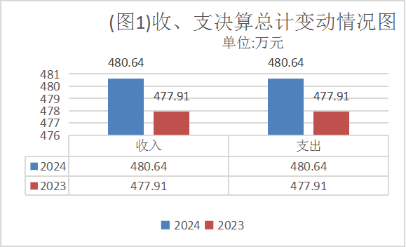 2024年度收、支总计均为480.64万元。与2023年度相比,收、支总计各增加2.73万元,增长0.57%。主要变动原因是一般公共服务支出增长。(图1:收、支决算总计变动情况图)(柱状图)