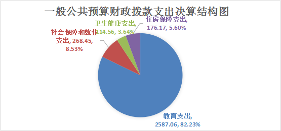 2024年度一般公共预算财政拨款支出3146.24万元,主要用于以下方面:教育支出2587.06万元,占82.23%;社会保障和就业支出268.45万元,占8.53%;卫生健康支出114.56万元,占3.64%;住房保障支出176.17万元,占5.6%。