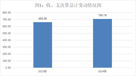 2024年度收、支总计708.78万元。与2023年相比,收、支总计各增加44.72万元,增长6.73%。主要变动原因是增加工资和项目资金增加。