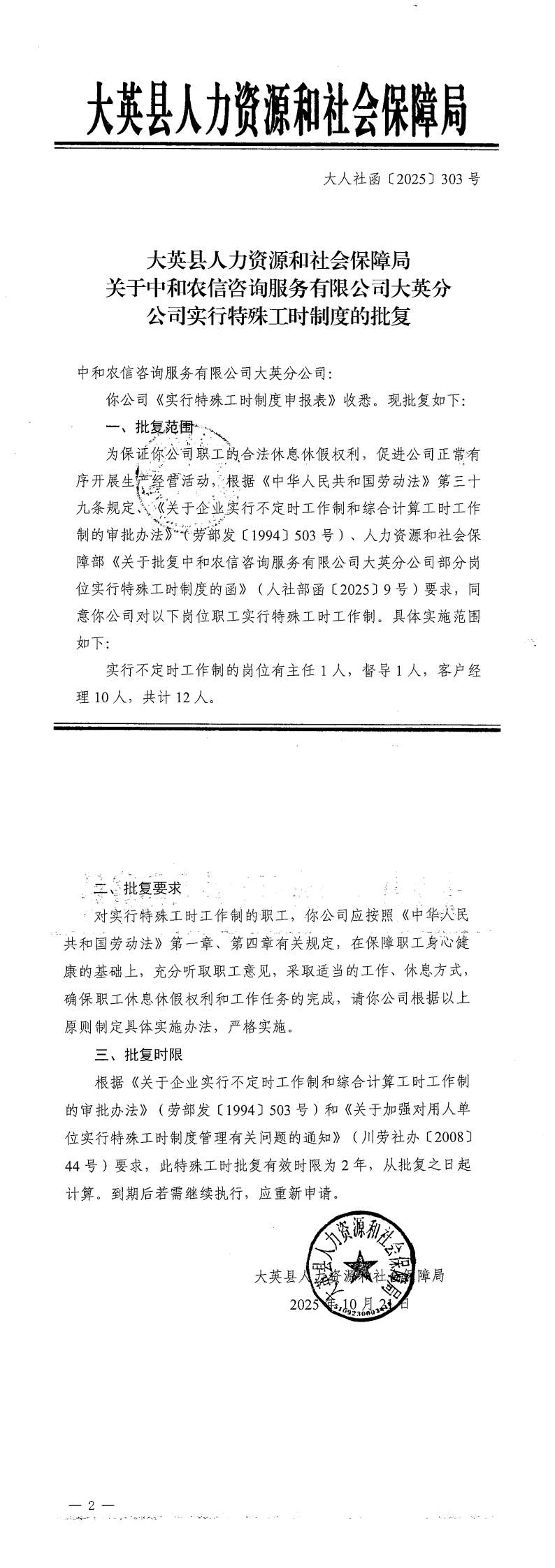 大英县人力资源和社会保障局关于中和农信咨询服务有限公司大英分公司实行特殊工时制度的批复