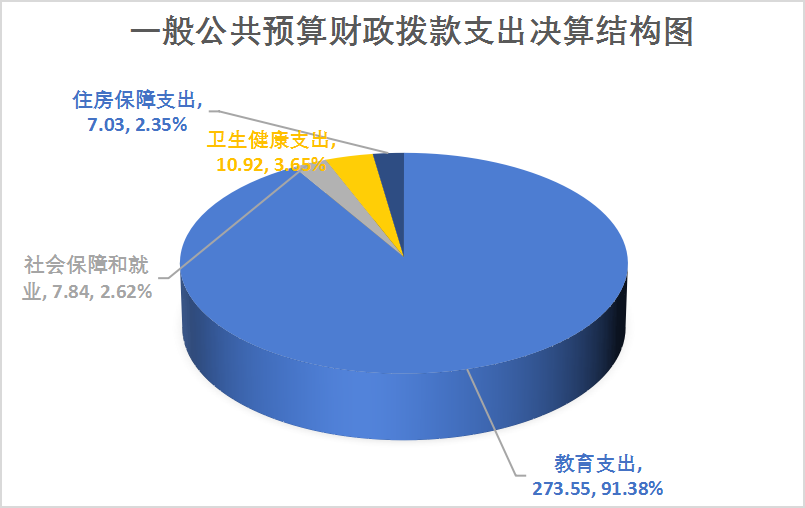 2024年一般公共预算财政拨款支出299.34万元,主要用于以下方面:教育支出(类)273.55万元,占91.38%;社会保障和就业(类)支出7.84万元,占2.62%;卫生健康(类)支出10.92万元,占3.65%;住房保障(类)支出7.03万元,占2.35%。