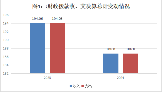 2024年度财政拨款收入总计186.8万元。与2023年度194.06万元相比,财政拨款收入总计减少7.26万元,减少3.7%。主要变动原因是基本支出减少。