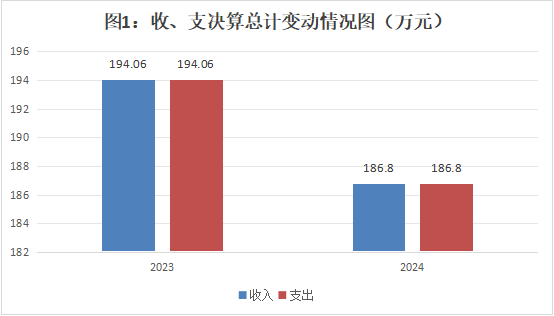2024年度本年收支总计186.8万元,与2023年相比,收入减少了7.26万元,减少3.7%,主要是因为2024年基本支出减少。支出总计186.8万元,与2023年相比,支出总计减少7.26万元,减少3.7%。主要变动原因是基本支出减少。