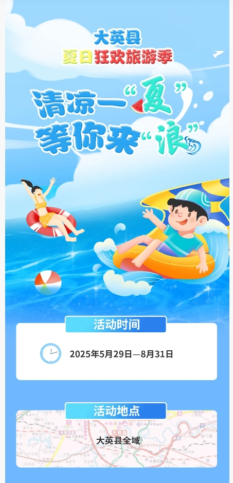 盛夏将至,大英喊你来耍!“清凉一‘夏’,等你来‘浪’”,2025夏日狂欢旅游季即将火热启幕盛夏将至,大英喊你来耍!“清凉一‘夏’,等你来‘浪’”,2025夏日狂欢旅游季即将火热启幕 盛夏将至,大英喊你来耍!“清凉一‘夏’,等你来‘浪’”2025夏日狂欢旅游季即将火热启幕你可以在中国死海体验特色盐疗与激情泼水在宋井桃源参与水上电音与民俗活动...