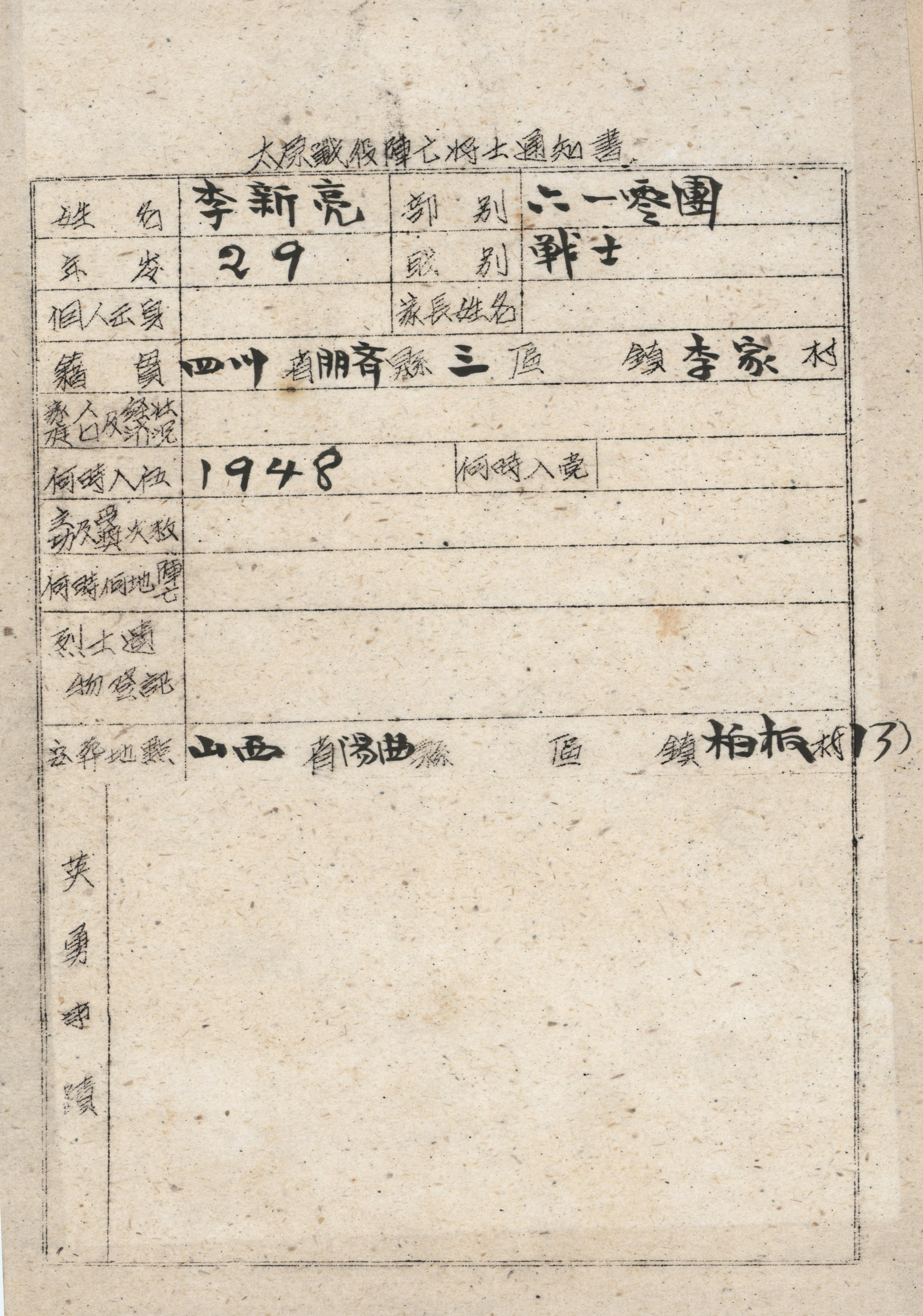 阵亡通知书记载:李新亮烈士是蓬溪县三区李家村人,牺牲时29岁,是解放军610团战士。