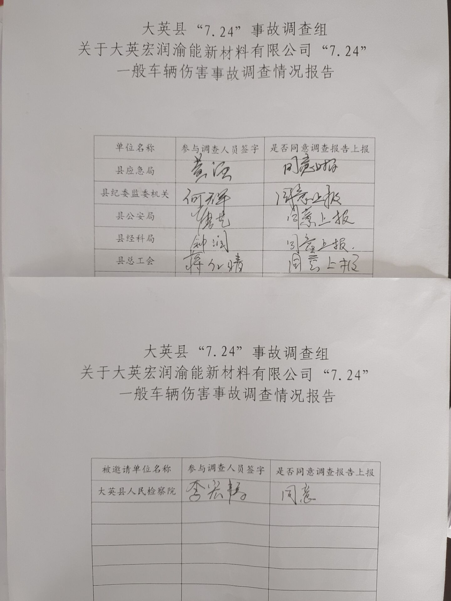 2022年7月24日上午8时20分,大英宏润渝能新材料有限公司发生一起场内车辆伤害事故,伤者苟和平经120医护人员确认已现场死亡。