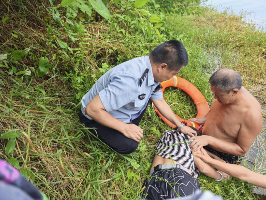 原来,两位村民在堰坎处乘凉时,发现同村50岁的文仁素女士在水边洗脚时不慎滑入深水区,正在水中挣扎。他们迅速取下镇政府在该水域统一安装的救生圈、救生衣等救生设备,纵身跃入水中,合力将落水者救援至对岸浅水区,避免了险情恶化。