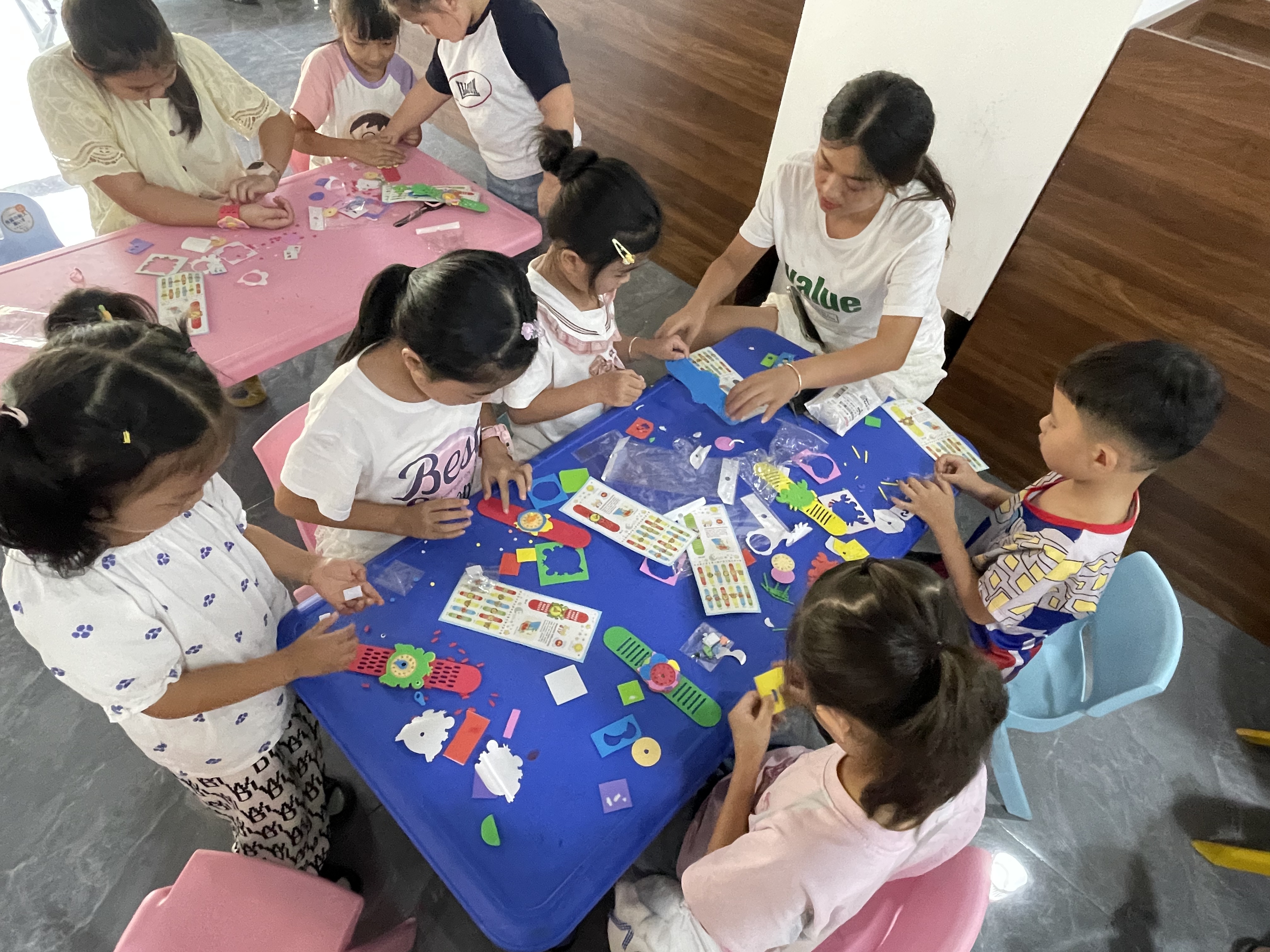 随后,活动进入手工制作环节。志愿者们提前准备了彩纸、胶水、剪刀、丝带等材料,童伴妈妈和家长们耐心指导小朋友们制作贺卡、小花束等手工礼物。孩子们充分发挥想象力,认真剪裁、粘贴、绘画,将对老师的祝福融入每一个细节——有的在贺卡上画满爱心,有的用彩纸折出娇艳的花朵,还有的写下“老师,祝您节日快乐”的暖心话语。短短一小时,一件件充满童趣与心意的手工礼物陆续完成,孩子们脸上洋溢着期待的笑容,盼着能早日将礼物送到老师手中。