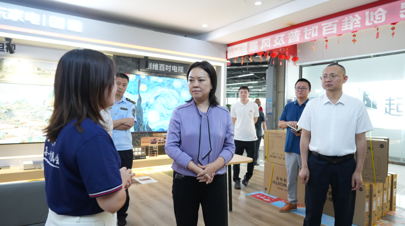 唐紫薇一行先后来到永逸广场京东家电商场、掌上明珠家具城及大英佳禾商贸有限公司(电信营业厅),详细了解家电、数码产品、家居商品销售情况、优惠政策实施进展和存在问题,并提出指导性意见。