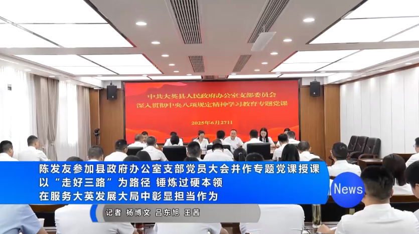 大英融媒体(记者 杨博文 吕东旭 王茜)6月27日,县委副书记、县长陈发友以普通党员身份参加县政府办公室支部党员大会,并围绕深入贯彻中央八项规定精神,为全体党员干部讲授了一堂专题党课。