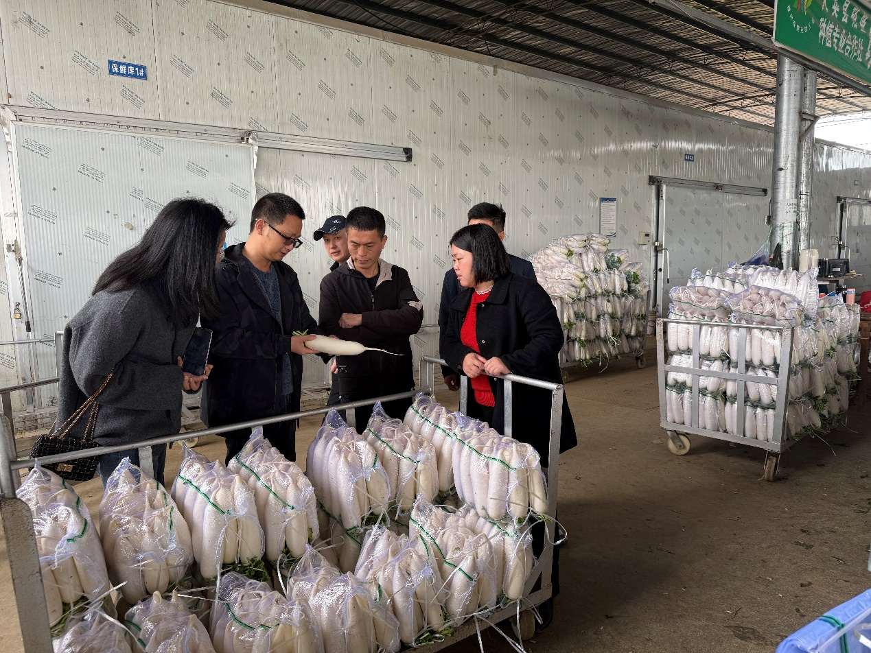 调研组深入回马镇萝卜种植核心区文武村及主产区花园村,实地查看萝卜种植规模、初加工车间及冷链物流中心,对当地萝卜种植技术、市场销售及品牌建设情况进行全面了解,详细考察了萝卜标准化种植、机械化采收、清洗分拣、冷链储运等全链条生产流程,并对产品质量把控、出口资质认证等环节与基层供销社负责人深入交流。调研组充分肯定回马镇萝卜产业规模化、标准化发展成效,认为其具备出口国际市场的基础条件。此次调研合作是供销系统服务县域经济、助力“川字号”农产品“走出去”的务实举措。