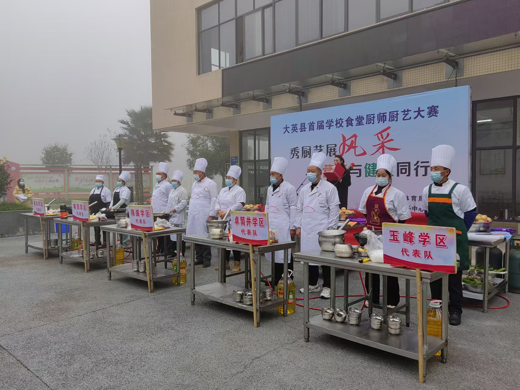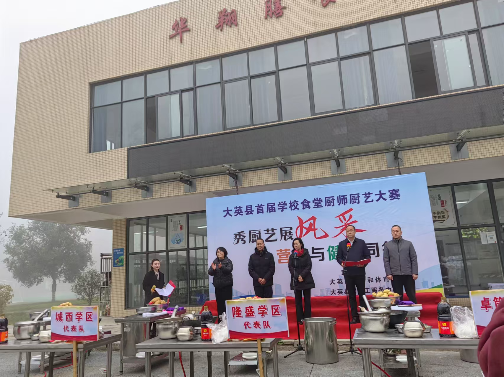 为进一步提高全县学校厨师技能水平,为全县农民工子女提供更优质的校园餐饮服务体验,解决转移就业农民工的后顾之忧,扎实做好春节期间服务保障农民工工作,12月26日,由县农民工服务中心、县教育体育局主办,县红旗学校、大英县成才职业技术培训学校承办的以“秀厨艺争风采,营养与健康同行”为主题的大英县首届学校食堂厨师厨艺比赛在大英县红旗学校举行。县委常委、宣传部部长翟宁凤同志参加开幕式并宣布大赛开幕。