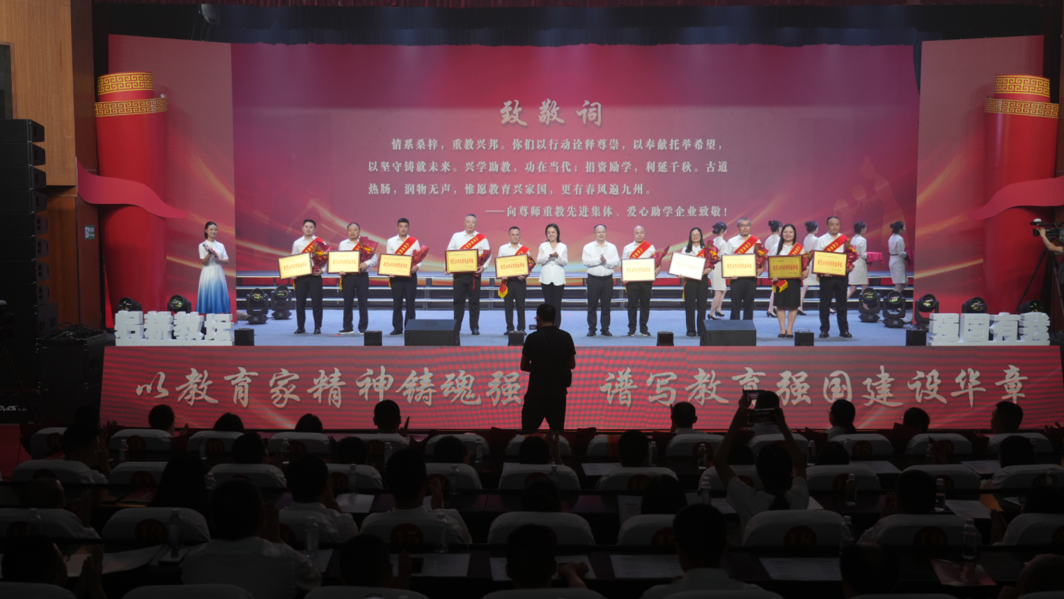 会上,新教师代表宣誓入职教师行列,誓言铮铮,薪火相传;县领导为模范退休教师、优秀教师、先进集体、爱心助学企业等颁奖,感谢他们为大英的教育事业做出的贡献。