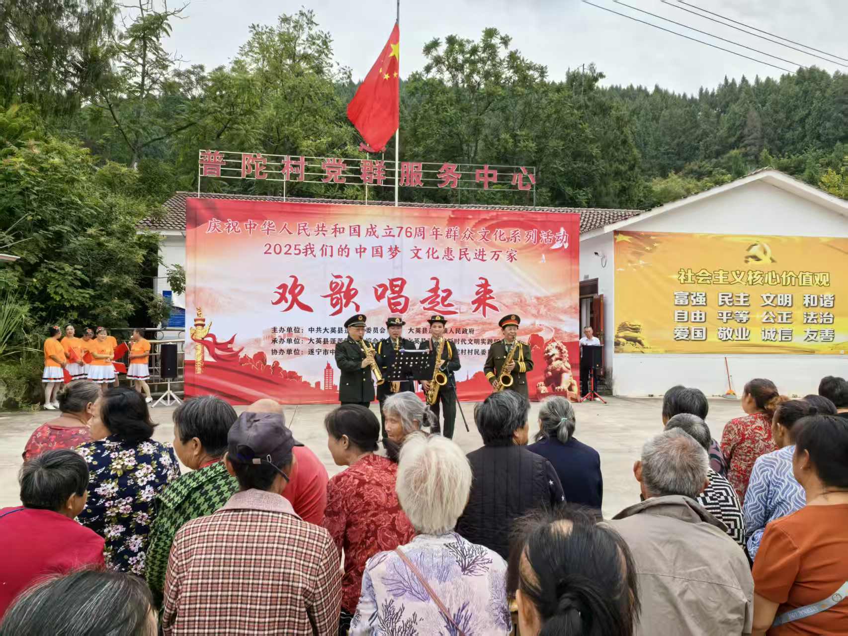 9月26日上午,蓬莱镇宣传文化服务中心与普陀村村委会共同组织“庆国庆·迎中秋”文艺汇演活动,现场吸引300余名村民及周边群众参与。遂宁市中医院党委副书记贺强、蓬莱镇镇长赵一鸣出席活动并致辞。
