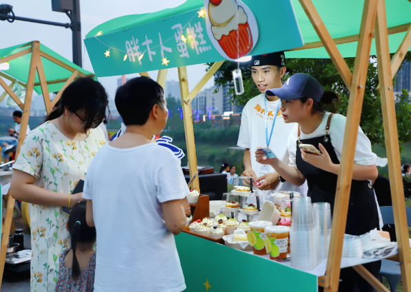 美食区的人气同样火爆。XJ·Coffee的咖啡、鲜榨果汁受到市民游客喜爱,成为拍照打卡新宠;卤虾摊位香气四溢,老板热情地邀请市民游客来“嗦虾”;冰粉摊主将水果与各式小料巧妙融合,碗里盛满“夏日清凉”。